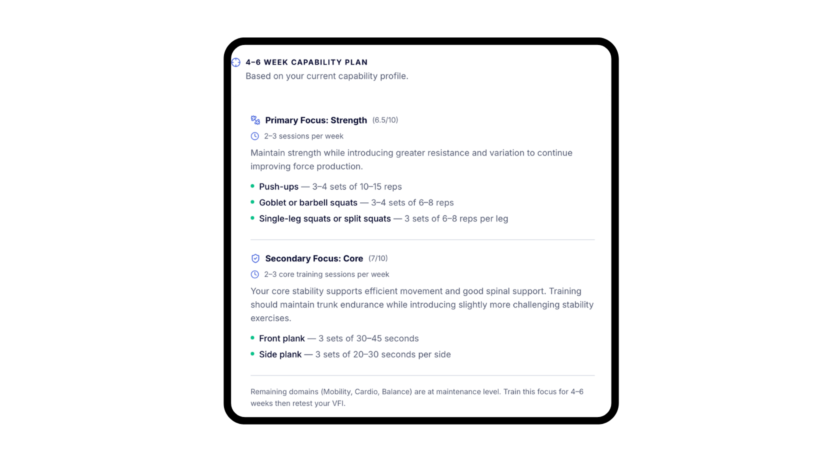 You receive your Vitranos Fitness Index score, a breakdown of your performance across the five domains, and insight into the capability that may be limiting your overall fitness, including exercise recommendations